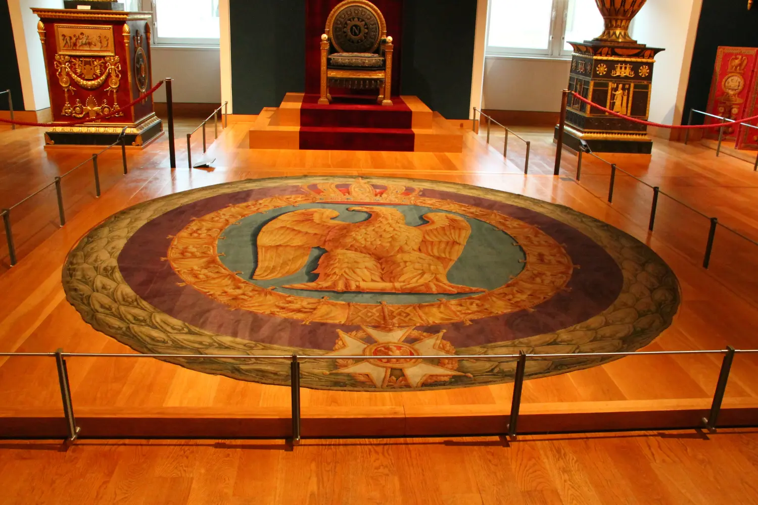In front of the throne, a large carpet bearing an imperial eagle within a medallion stretched across the polished floor.