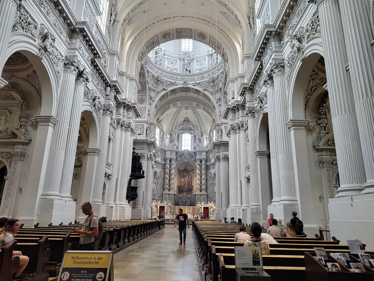 Right next to it rises the bright yellow façade of Theatinerkirche, also known as the Theatine Church of St. Cajetan. From the outside, its bold yellow color stands out immediately, but stepping inside feels like entering another world entirely.