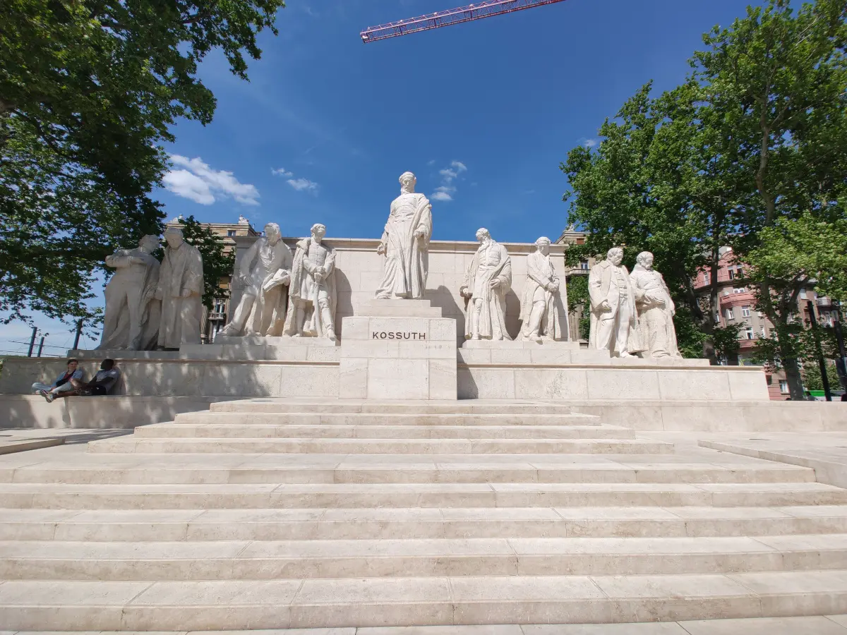 The striking white statues depict Kossuth surrounded by his fellow patriots, symbolizing Hungary’s enduring fight for freedom and independence.