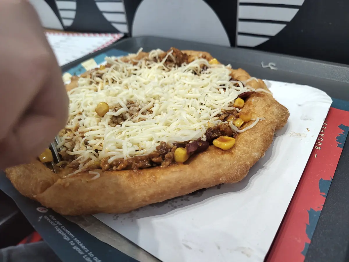 After so much walking and sightseeing, it was definitely time to eat – and in Budapest, that can only mean one thing: lángos! This deep-fried flatbread, usually topped with sour cream, grated cheese, and garlic, is one of Hungary’s most beloved street foods, and tasting it is a must during any visit to Budapest. Crispy on the outside, soft inside, and full of flavor, it’s the kind of comfort food that instantly refuels you for more exploring.